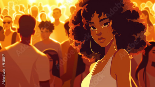 As the sun sets, a young woman with curly hair gazes confidently at the camera, surrounded by a lively crowd enjoying the festival vibes