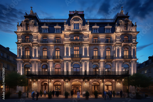 As twilight sets, the majestic facade of a historic hotel comes to life, its vintage signboard glowing warmly, welcoming guests who are captured in the midst of their arrival.