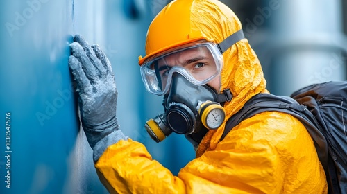 Asbestos Abatement Professional in Protective Gear Carefully Removing Contaminated Insulation Panels from an Old Industrial Building during Renovation or Demolition Project