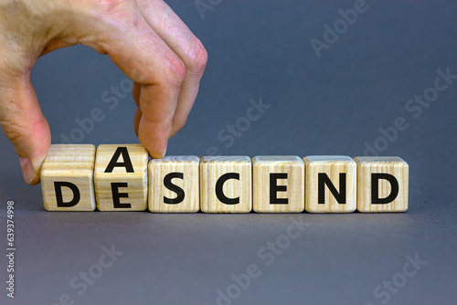 Ascend or descend symbol. Concept words Ascend and Descend on wooden cubes. Beautiful grey table grey background. Businessman hand. Business ascend or descend concept. Copy space.