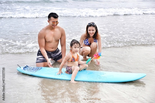 asia family father and mother and daughter happy life on the beach with surfboard, travel the sea in rayong thailand