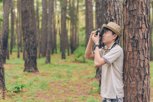 Asia man wears shirt, and hat are stand against the tree and taking photos at the forest.