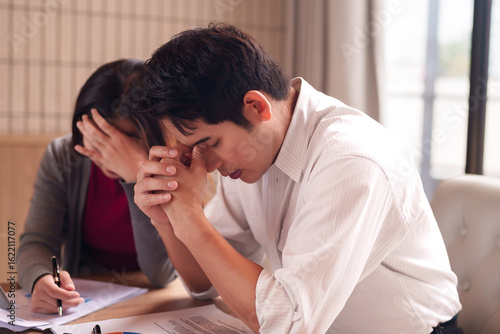 Asian adult professionals facing business financial problems during office meeting corporate struggle economic hardship challenging times