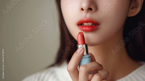 Asian beautiful woman with smooth, fair skin, looking modern, is expressing satisfaction with her complexion. With clear background