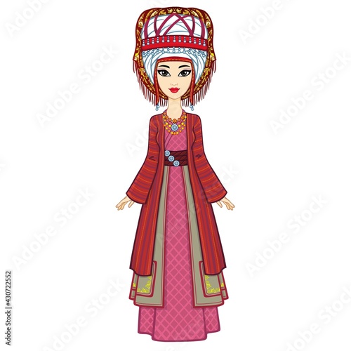 Asian beauty. Animation portrait of a beautiful girl in ancient national costume and turban. Married woman's headdress. Full growth. Central Asia. Vector illustration isolated. White background.