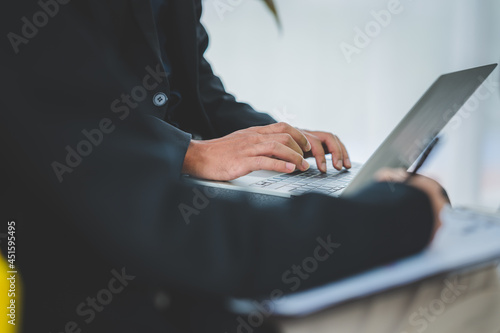 Asian business hold a small meeting inside the office or conference room. Brainstorm to exchange ideas. There are stock boards Laptops and tablets are communication tools. Unity teamwork concept.