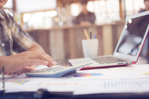 Asian Business man using a calculator to calculate the numbers with calculator laptop calculate technology in cafe office, working male analyse the data management finance