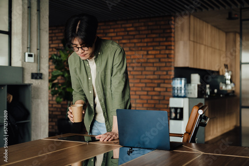 Asian business man working on digital tablet and drinking coffee while standing in office