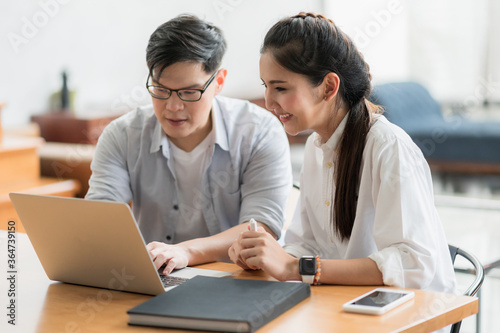 Asian business people man and woman conference talking and working with laptop together. Young couple work at home.