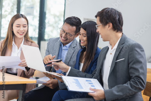 Asian business teamwork working with analysis report and advisor showing plan, Financial analysis and Marketing teamwork concept.