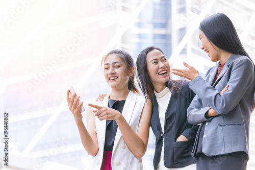 Asian business woman group happy shopping online with tablet in city women shopping concept