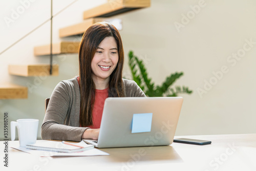 Asian business woman using technology laptop and mobile phone for work from home in indoor modern house, freelance and entrepreneur,startups and business owner, social distance and self responsibility
