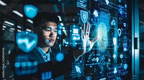Asian businessman interacting with futuristic holographic security interface displaying digital protection symbols and biometric scanning in dark office.