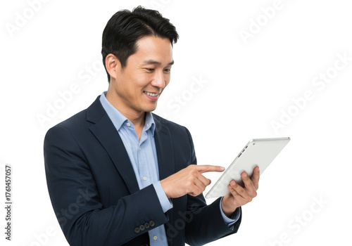 Asian businessman smiling while using a white tablet computer with his finger transparent background