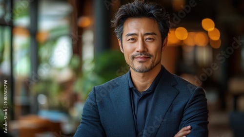 Asian businessman standing confidently in a bright office setting.