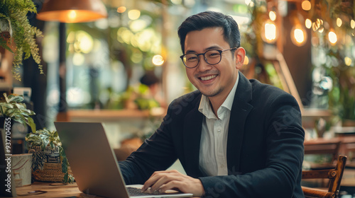 Asian businessman typing on laptop during work in cafe. Concept of remote and freelance work. Smiling adult successful man wearing suit and glasses sitting at wooden desk. Sunny day