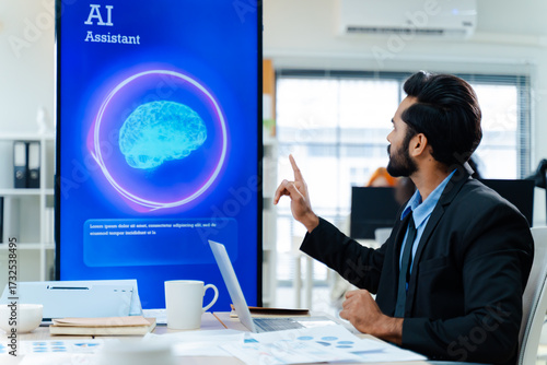 Asian Businessman use artificial intelligence AI Assistant technology for solve work problems,enhanced work efficiency data analysis,efficient tools,Unlocking work potential,AI technology in corporat