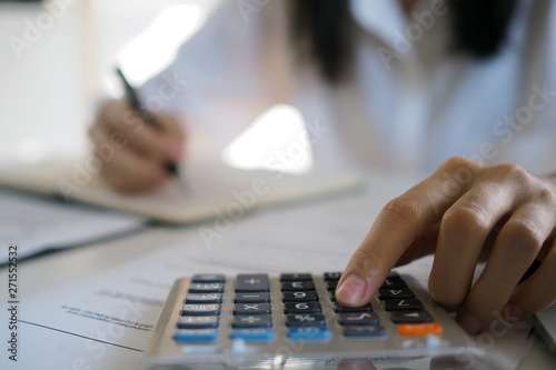 Asian businessmen work with calculators to calculate account information. In the office, work desks with documents and computers