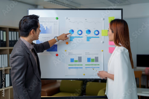 Asian businesspeople analyzing financial charts and graphs on whiteboard during a presentation in office
