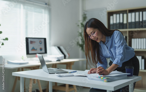 Asian businesswoman analyzing financial charts and graphs while working with documents and utilizing a laptop in a modern office, displaying focus and dedication to her tasks