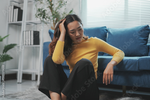 Asian businesswoman feeling stressed and having a headache while working from home, sitting on the floor near the sofa