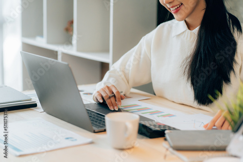 Asian businesswoman in formal suit in office happy and cheerful during using smartphone and working