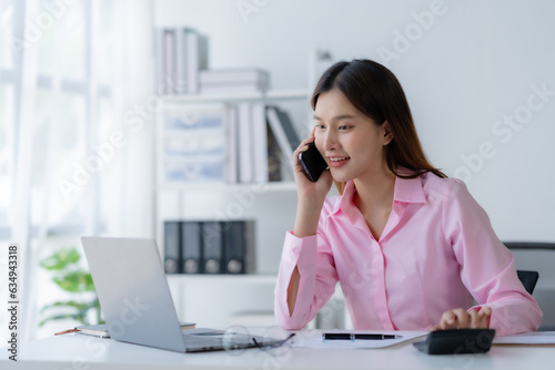 Asian businesswoman modern professional talking with client on the phone with a confident demeanor and effective communication skill. business, marketing, sale and communication project.