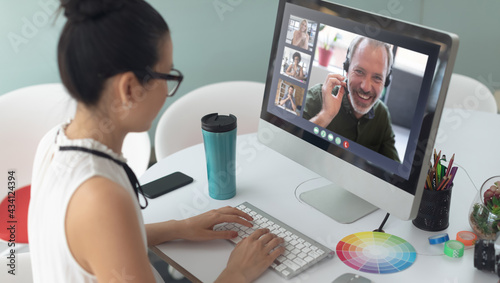 Asian businesswoman sitting at desk using computer having video call with colleagues