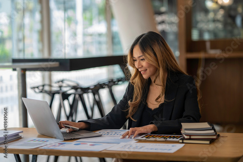 Asian businesswoman sitting working on laptop in office. tax, accounting, financial concept