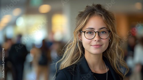Asian businesswoman standing in a modern office, smiling with a look of tranquility and confidence, finance recruiter cover