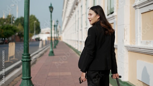 asian businesswoman walking with luggage and phone on city sidewalk looking back confidently