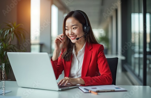 Asian businesswoman wears red blazer, headset working in modern office. Woman uses laptop computer smiling during online meeting or customer service. Successful female entrepreneur focused, confident.
