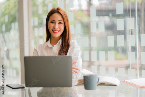 Asian businesswoman working in finance and calculator working with laptop computer with paper documents at office Technology market and financial concepts