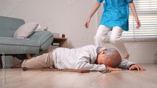 Asian caregiver helping senior male from falling on the ground. Older elderly man patient having accident heart attack when physical therapy. Nurse assistance rescue concept.