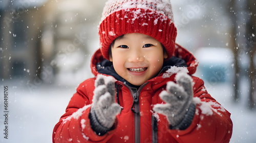 Asian child boy wears a red coat beanie and gloves smiles while playing with snow, winter snowy season christmas holidays