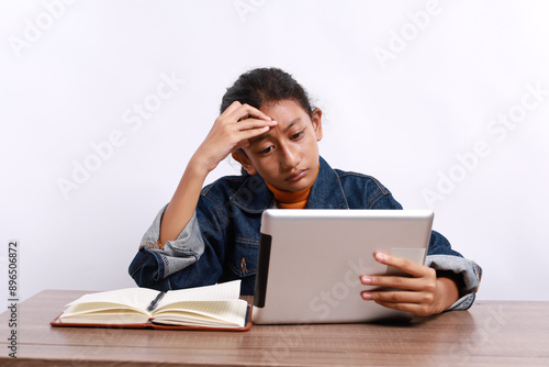 asian child headache on studying online class or kid girl student thinking or stressed learning on computer tablet by video call or person learn from home school and holding to head