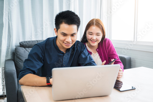 Asian couple online shopping ecommerce together from home modern living room using phone computer laptop tablet payment paying transaction money transfer credit debit card smiling happy joyfully