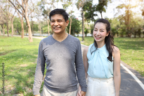 asian couple walking and talking in the park with happy face