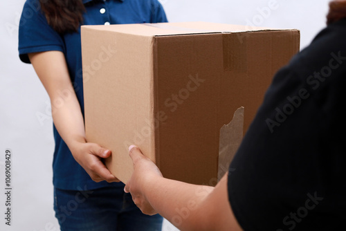 Asian courier woman in blue uniform delivering cardboard box parcel to person. Isolated on white background