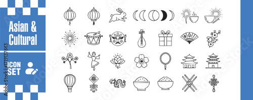 Asian cultural icon set collection of traditional symbols such as lanterns, rabbit, moon phases, tea, drum, fish, lute, gift, fan, blossom, pagoda, and rice