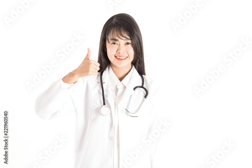 Asian Doctor woman smile and showing thumbs up,Isolated on white background