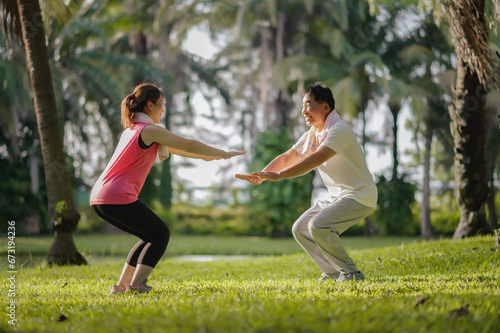 Asian Elderly Father and Daughter Enjoyed Exercising Together in The Natural Green Park. Health care and family bonding.