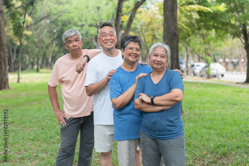 Asian elderly men and women Standing for photographers to take photos in the park before playing sports and exercising. Smile happily in retirement, take care of your health