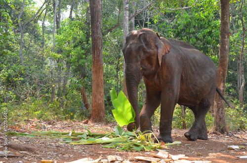 Asian Elephant Eating Banana Leaves in the Forest, Cambodia