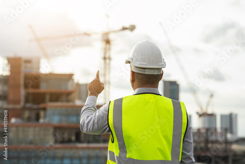 Asian engineer man or architect looking forward with white safety helmet in city construction site . Standing on rooftop building construction at capital.