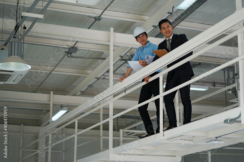 Asian engineer wearing hard hat talking with business man in formal suit in the factory