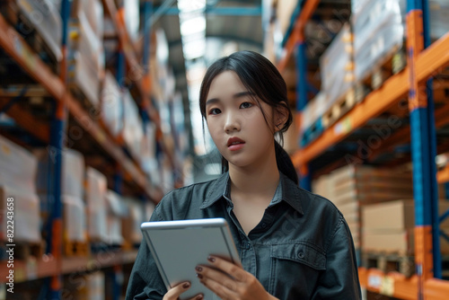 Asian entrepreneur coordinating warehouse activities, highlighting leadership and teamwork in optimizing workflow processes.