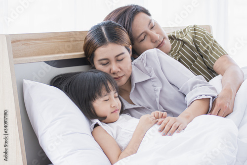 Asian family is sleeping on the bed
