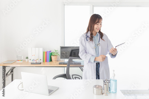 asian female doctor stand and prepare do work in clinic office, she holding patient chart and order medicine in hospital, treatment information