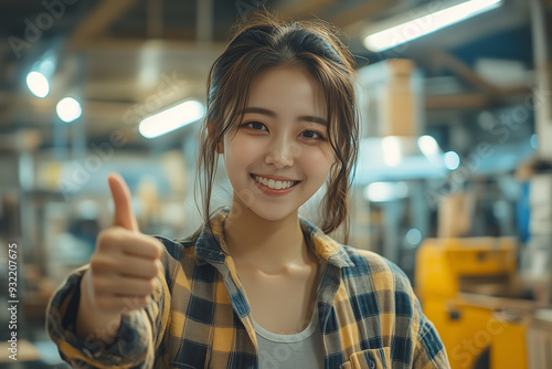 Asian female employee Smiling in a wooden furniture factory, she is giving a thumbs up.